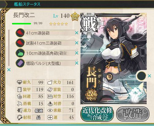 2017年5月22日のアップデートにより、長門の改二実装されましたので早速改装してきました。